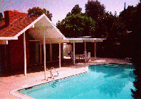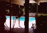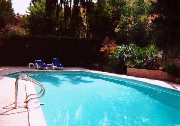 This is the first time we have had our own pool and we love it! Over to the right of the pool, where you can't see it is an eight foot tall papier-mache Tiki idol which is left over from the time they filmed an Hawaiian Punch commercial in our back yard.