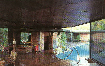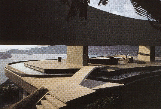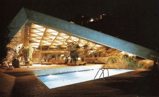 exciting use of materials. The Sheats House has dynamic triangular roof lines and walls of glass that place no barrier between the shelter within and the outside world at your feet. The sensuously curving cast concrete Arango House is surrounded and embraced by a pool than flows through it and then flows out to and over the edge of the structure to reflect the serene and unobstructed beauty of the blue sky and waters of Acapulco Bay.Lautner buildings are logical. Despite their originality and drama, my overwhelming impression of each one has always been, "But, of course!" Lautner once said he had to have "eight to ten good reasons to do anything." Nothing is accidental nor arbitrary. Every single item, from the foundation to the