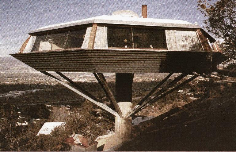 Chemosphere -- a four-bedroom house shaped like an hexagonal flying saucer perched high atop a single hollow concrete column. He also designed the Carling House whose living room pivots on a turntable to transform itself into an outdoor patio overlooking the lights of the city.Lautner buildings are dramatic with bold geometry and